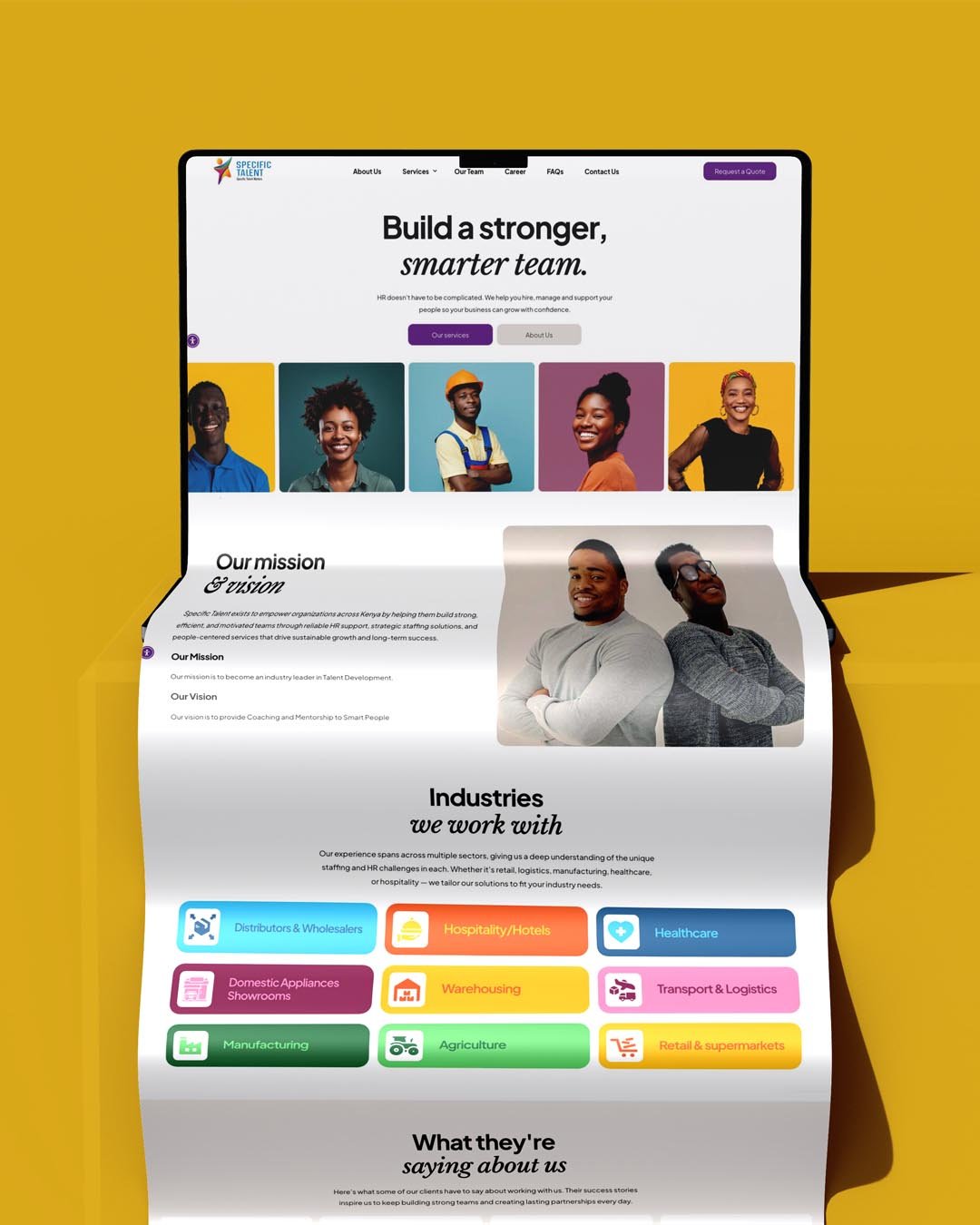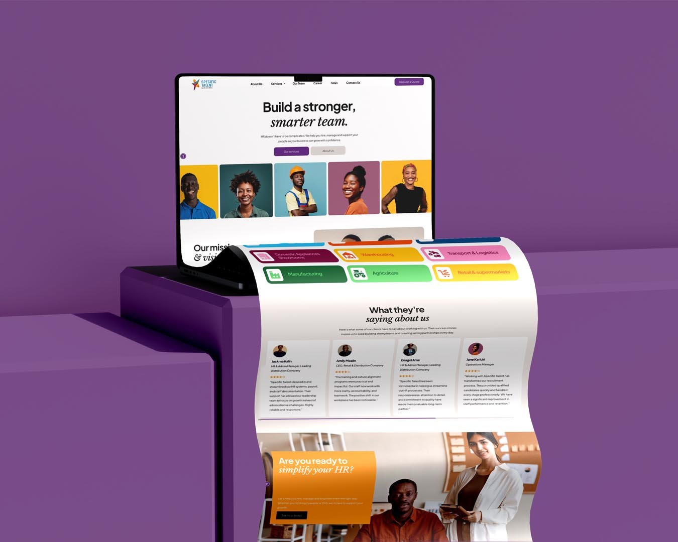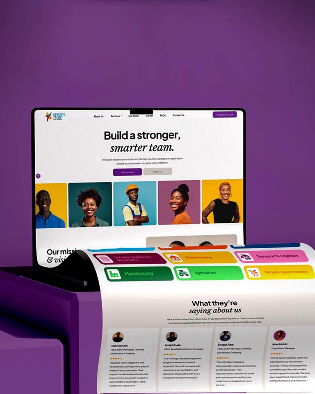 We designed the Specific Talent website to clearly communicate the brand’s mission of connecting the right talent to the right opportunities through a clean, professional, and user-focused digital experience. The website features a modern layout, intuitive navigation, and responsive design to ensure seamless access across all devices. With a strong emphasis on clarity, credibility, and conversion, the design highlights Specific Talent’s services, values, and expertise while maintaining a polished corporate feel. This project demonstrates our capabilities in professional website design, talent and recruitment branding, and UX-driven web development, resulting in a site that builds trust, enhances visibility, and supports business growth.